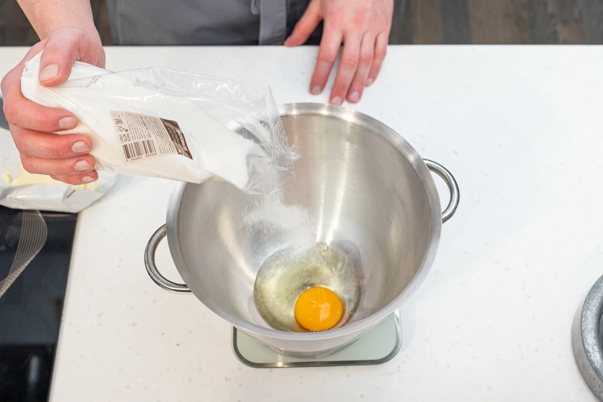 Яйцо взбить с обычным и ванильным сахаром до пышной пены, затем, продолжая взбивать, подлить растопленное сливочное масло.