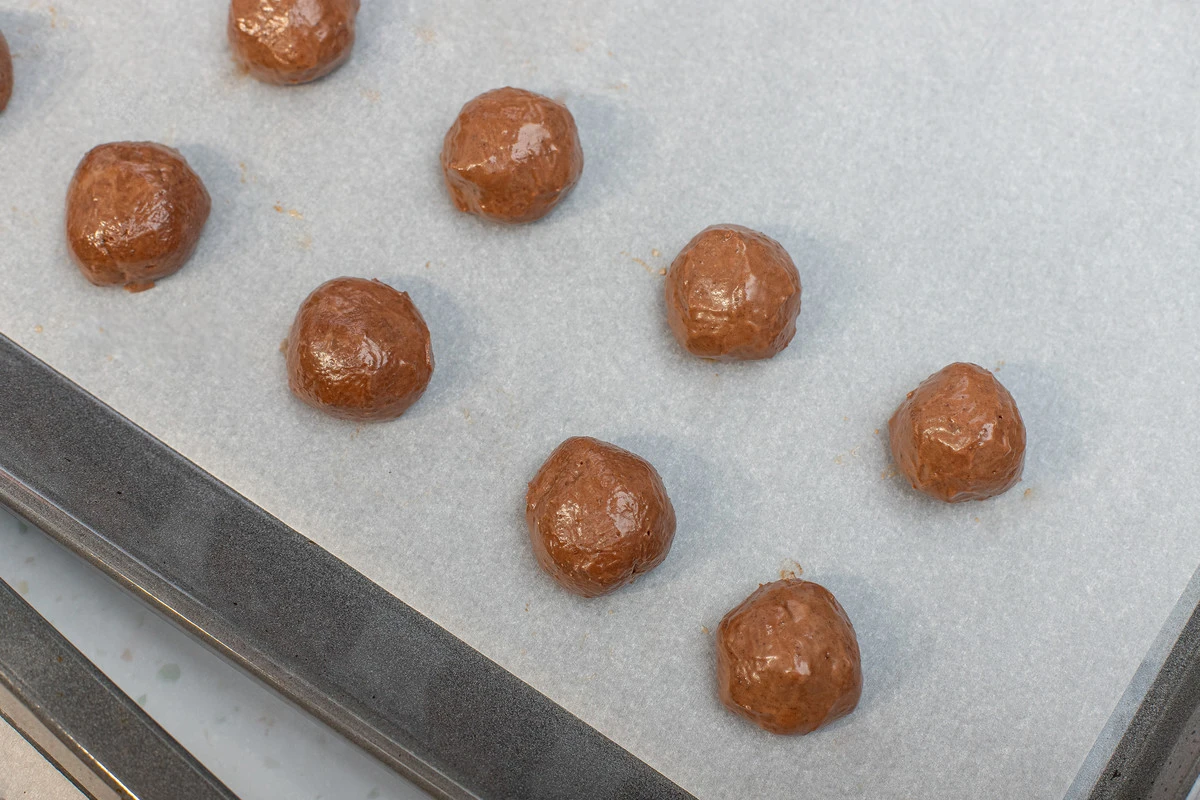 Используя примерно по столовой ложке теста, сформируйте небольшие шарики и выложите их на противень, застеленный пергаментом, на расстоянии 7-8 см друг от друга. Выпекайте 14 минут при температуре 180°C.