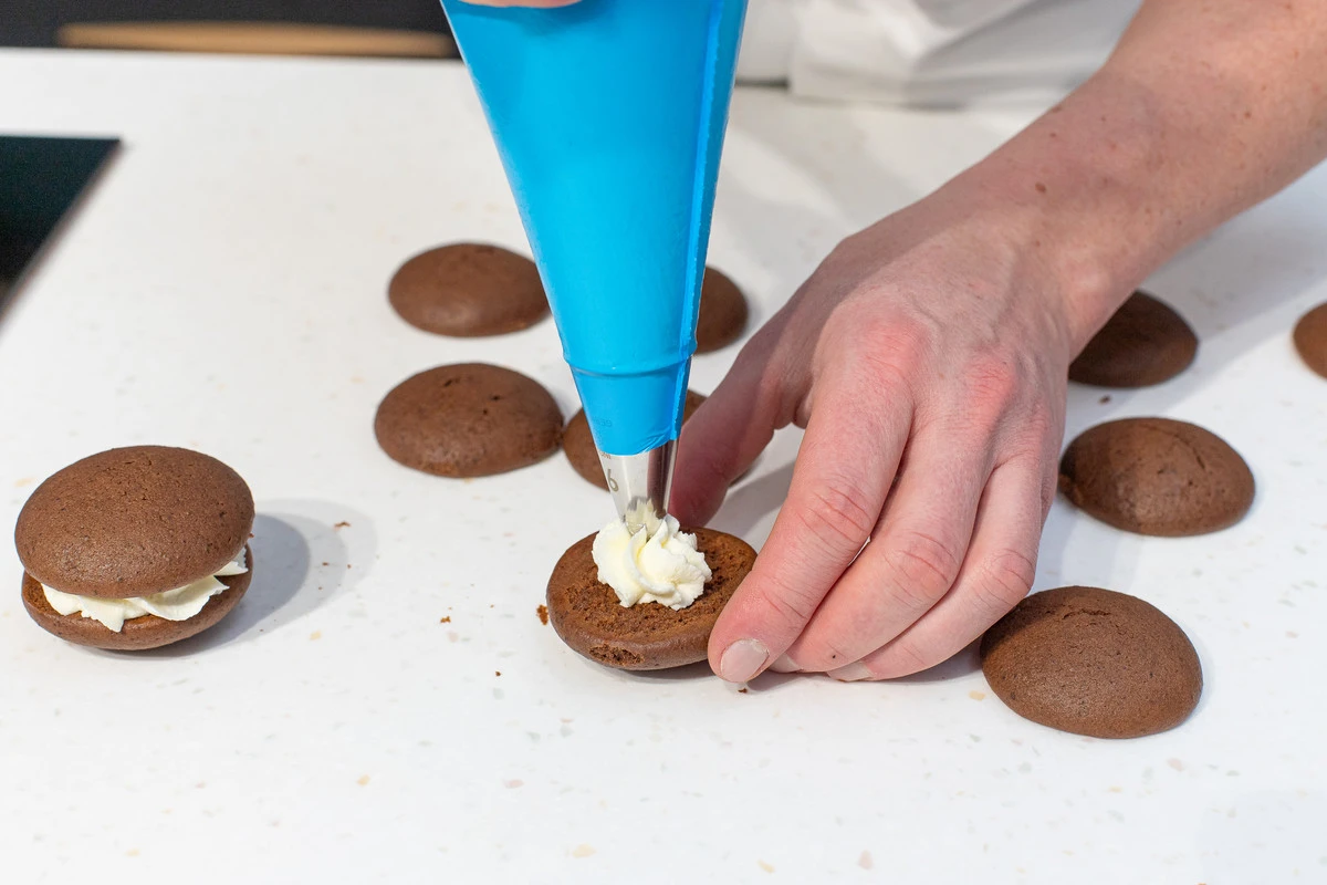 На охлаждённые бисквиты выложите крем с помощью кондитерского мешка и соберите как сэндвичи.