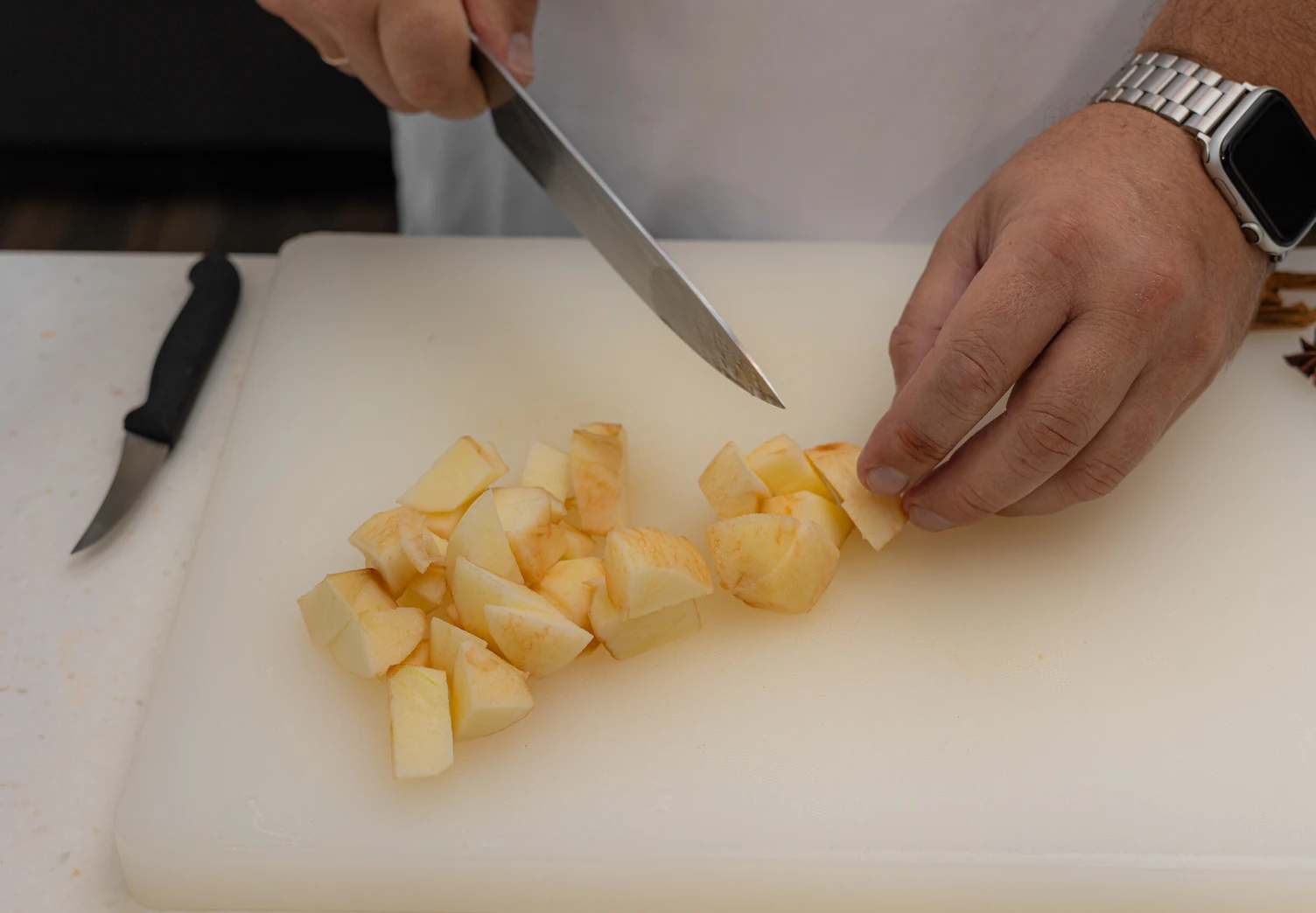Снимите с яблок кожуру, удалите семенные коробочки и косточки. Должно получиться 500–600 г очищенных плодов. Нарежьте яблоки крупными кусками и сложите в кастрюлю с толстым дном.