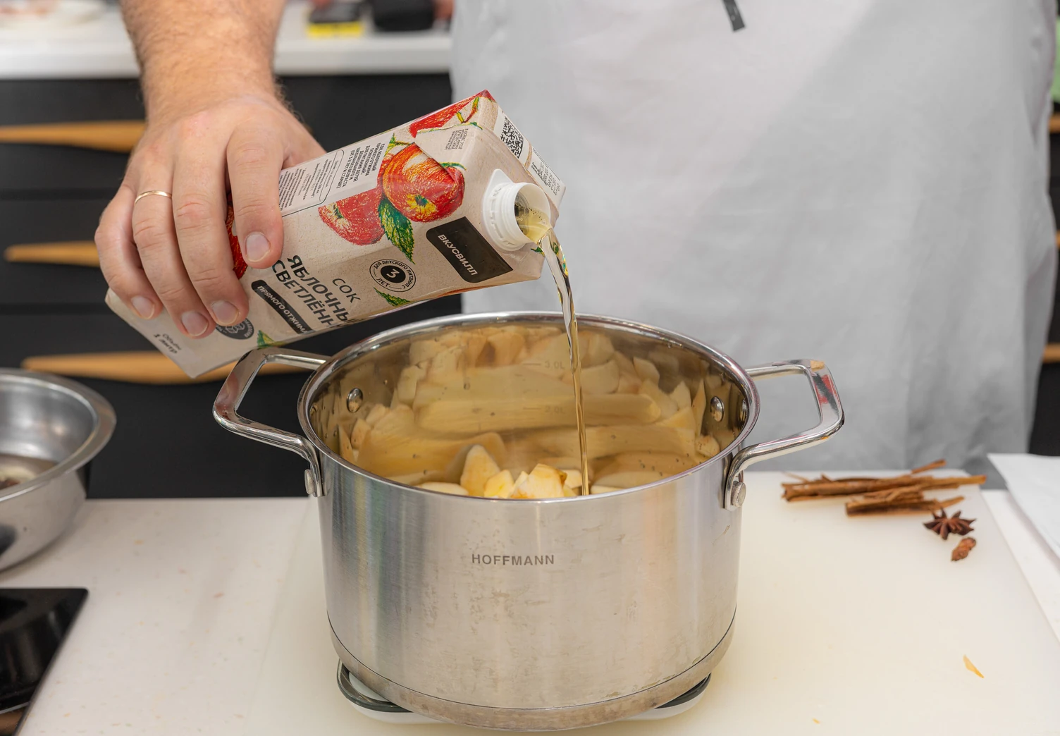 Налейте в кастрюлю яблочный сок, добавьте корицу и бадьян.