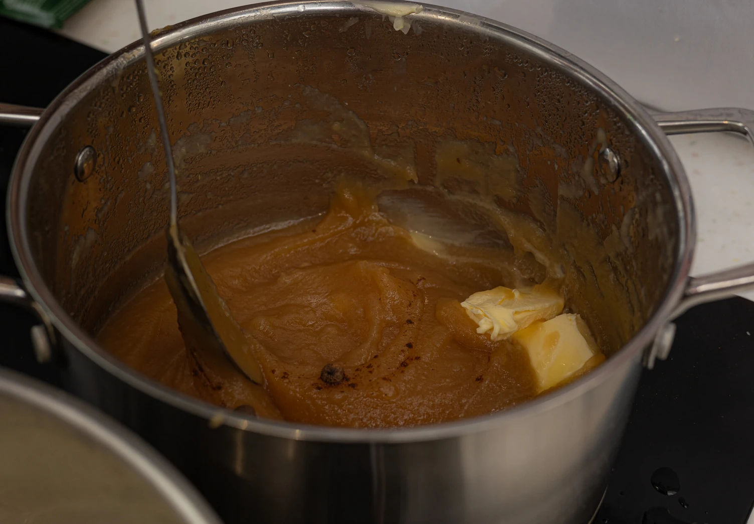 Во время приготовления не отходите далеко от плиты и периодически перемешивайте масло. Если хотите получить более гладкую и шелковистую текстуру, можно ещё раз взбить массу блендером.