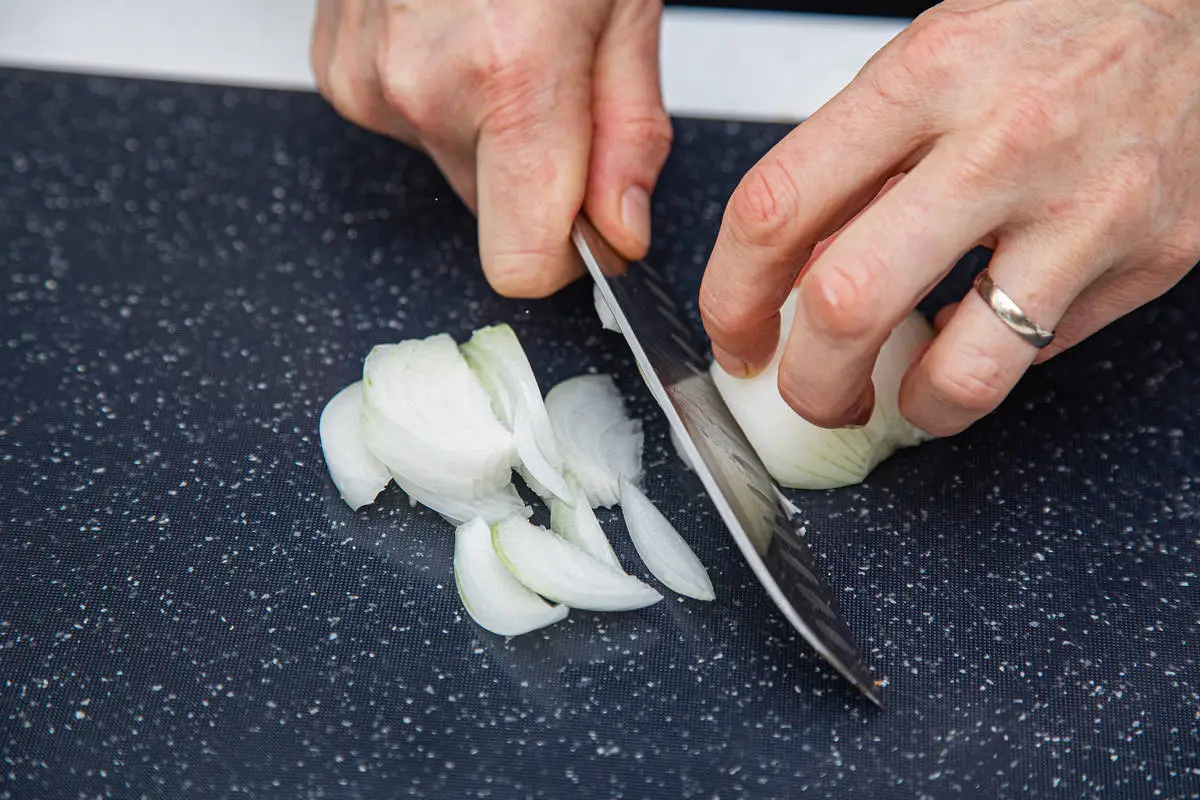 Лук очистите и нарежьте перьями.
