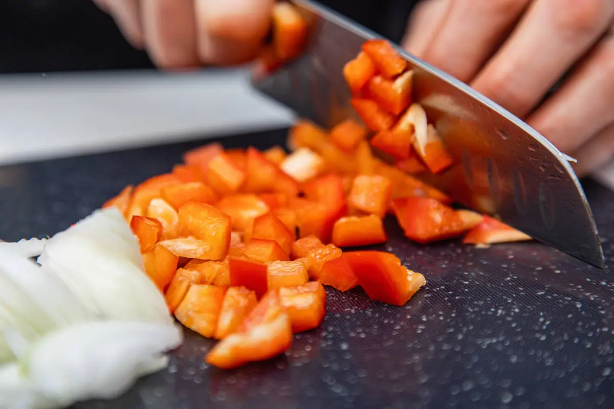 Перец нарежьте кубиками.