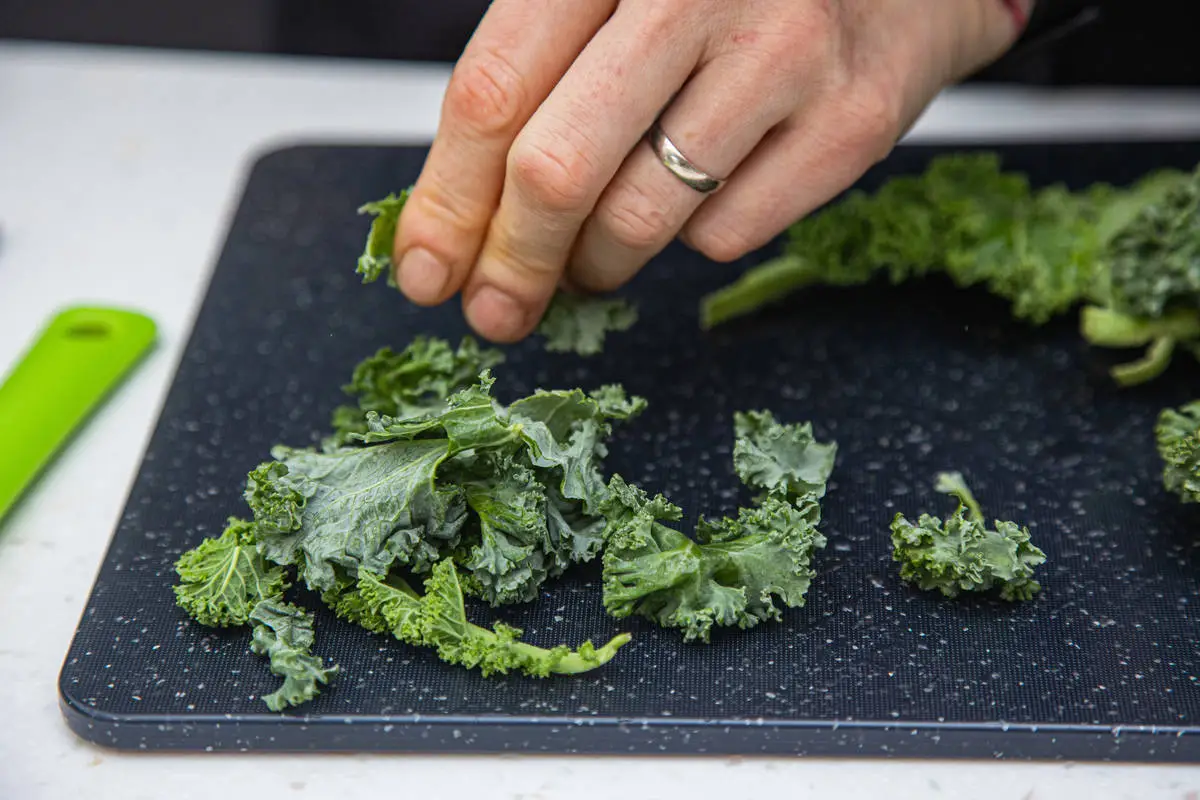 У листьев кейла удалите жёсткие стебли, сами листья слегка разомните руками с солью.