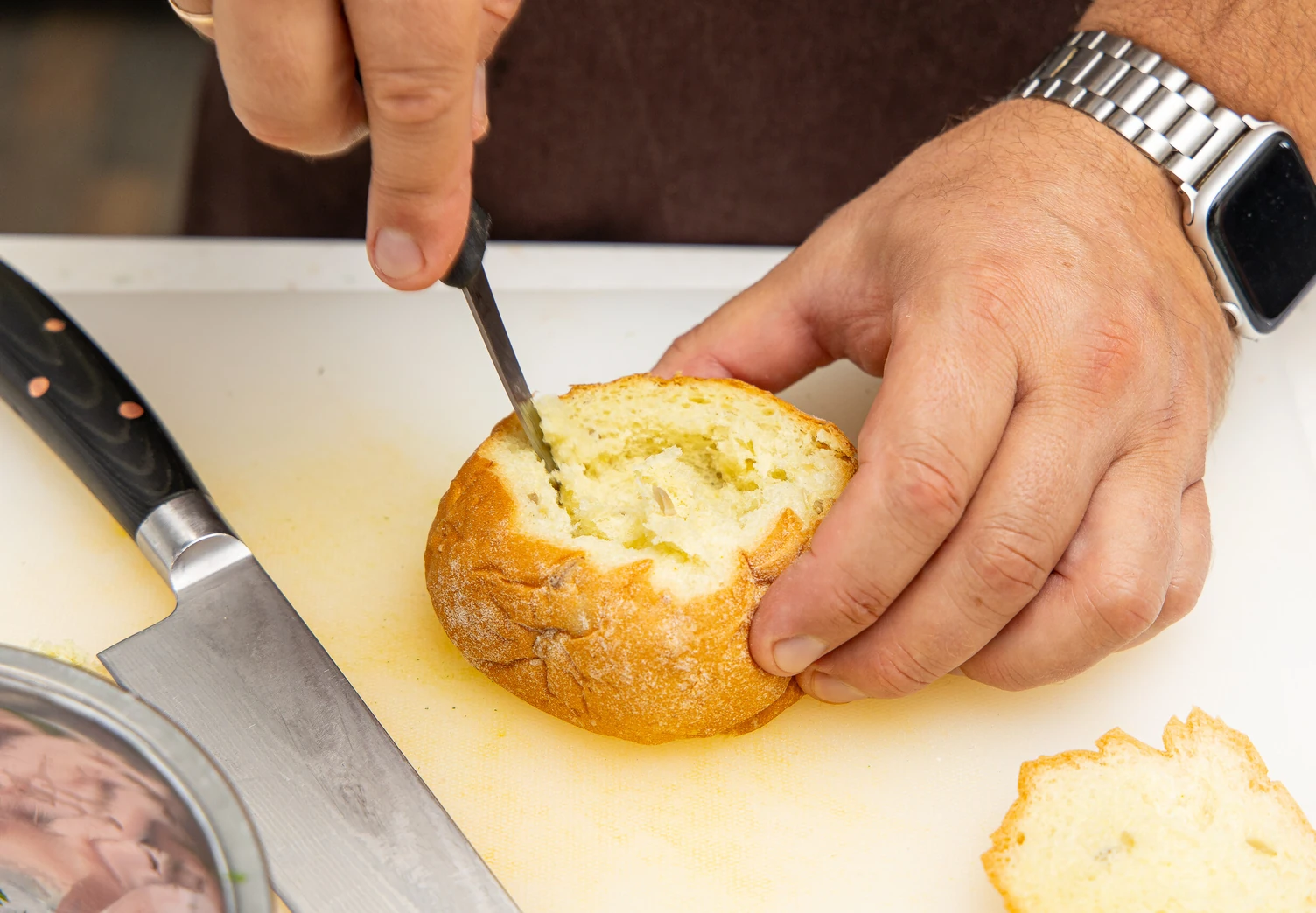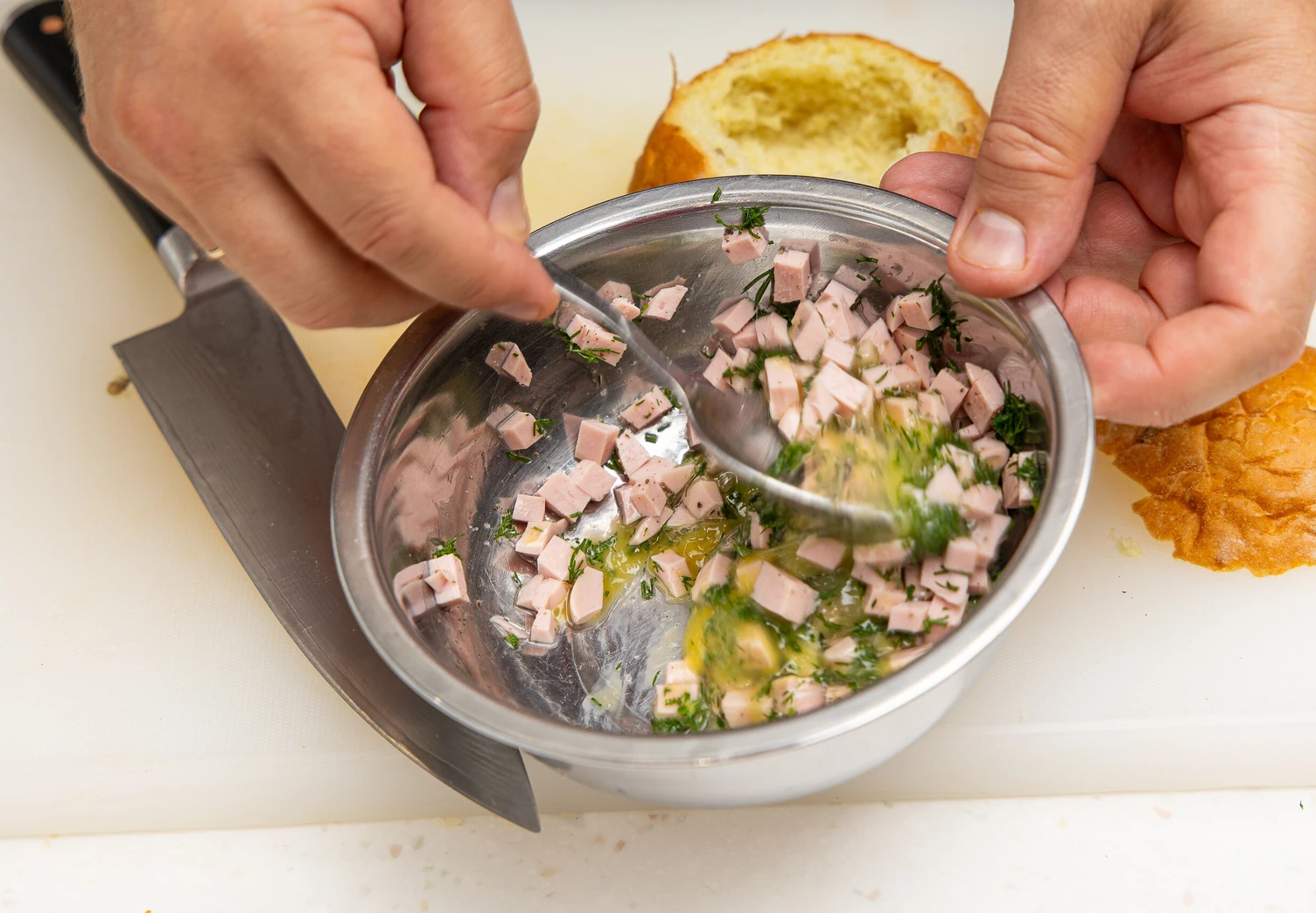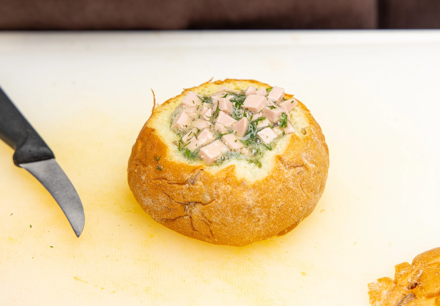 Срежьте верх у булочек и аккуратно удалите мякиш, стараясь не повредить стенки.