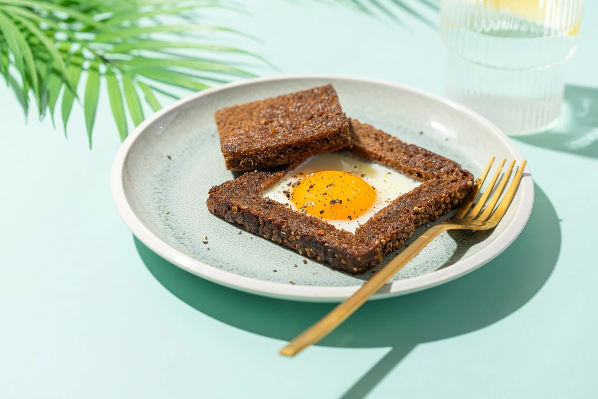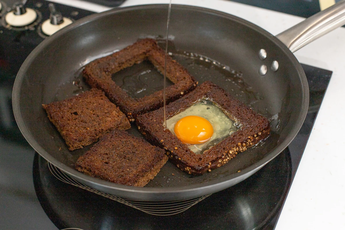 «Яйцо в окошке» чаще делают с белым тостовым хлебом, но нам кажется, что с бородинским вкус получается более ярким и интересным. Не забудьте подать к такой яичнице свежие помидоры и листья салата.