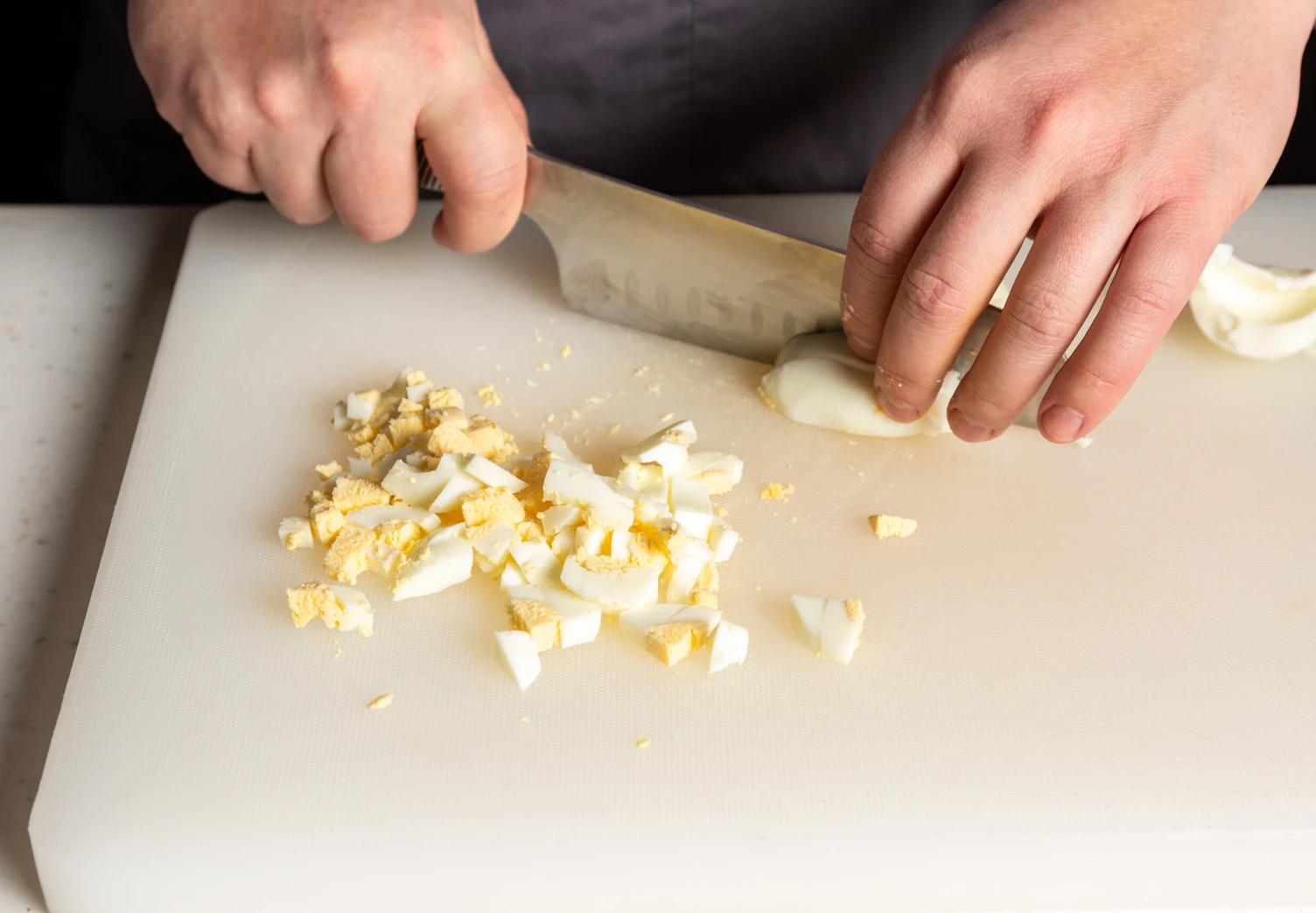 Отварите яйца вкрутую и нарежьте средним кубиком.