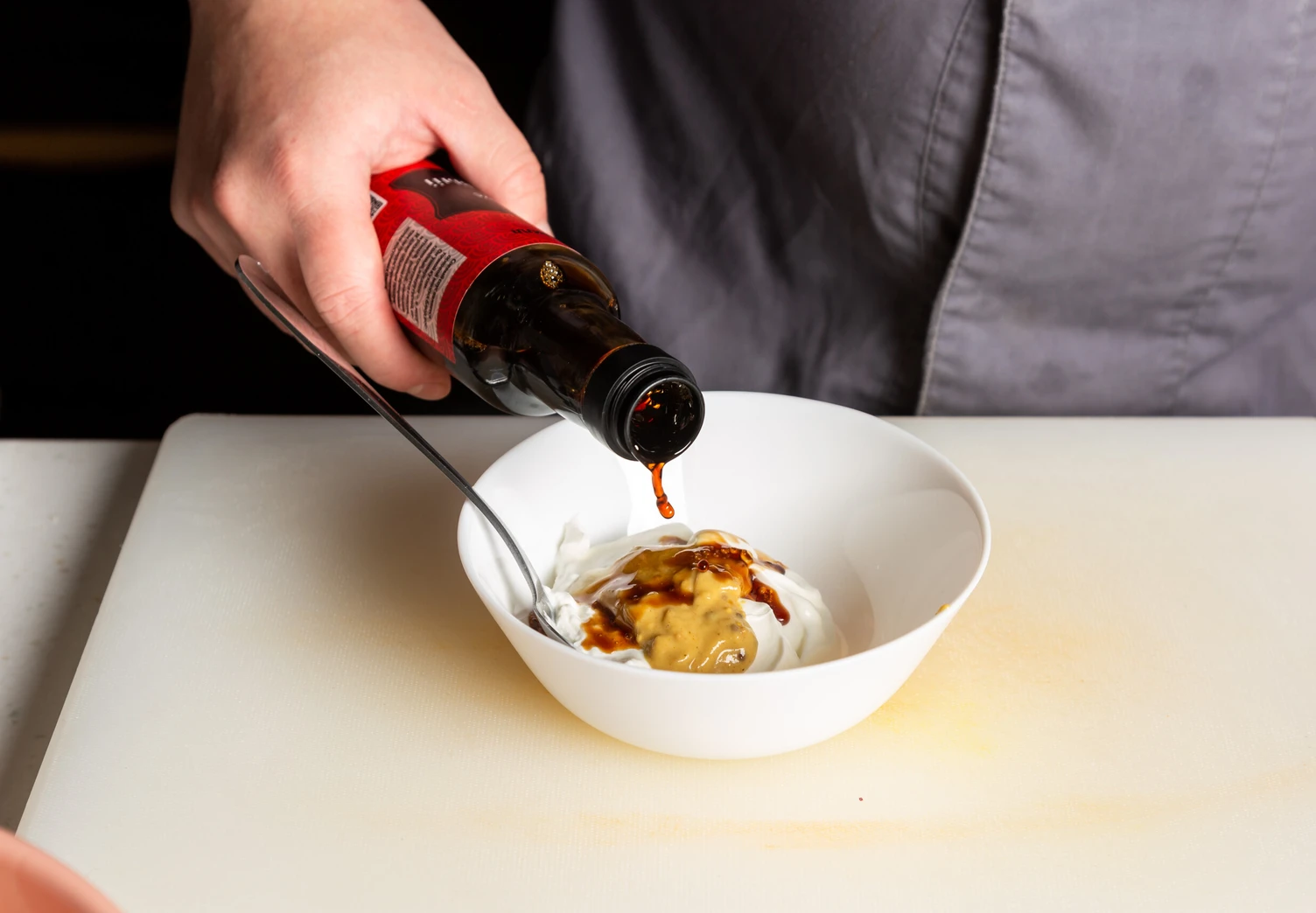 Приготовьте заправку, смешав сметану, мёд, соевый соус, соль, чёрный дроблёный перец и дижонскую горчицу.