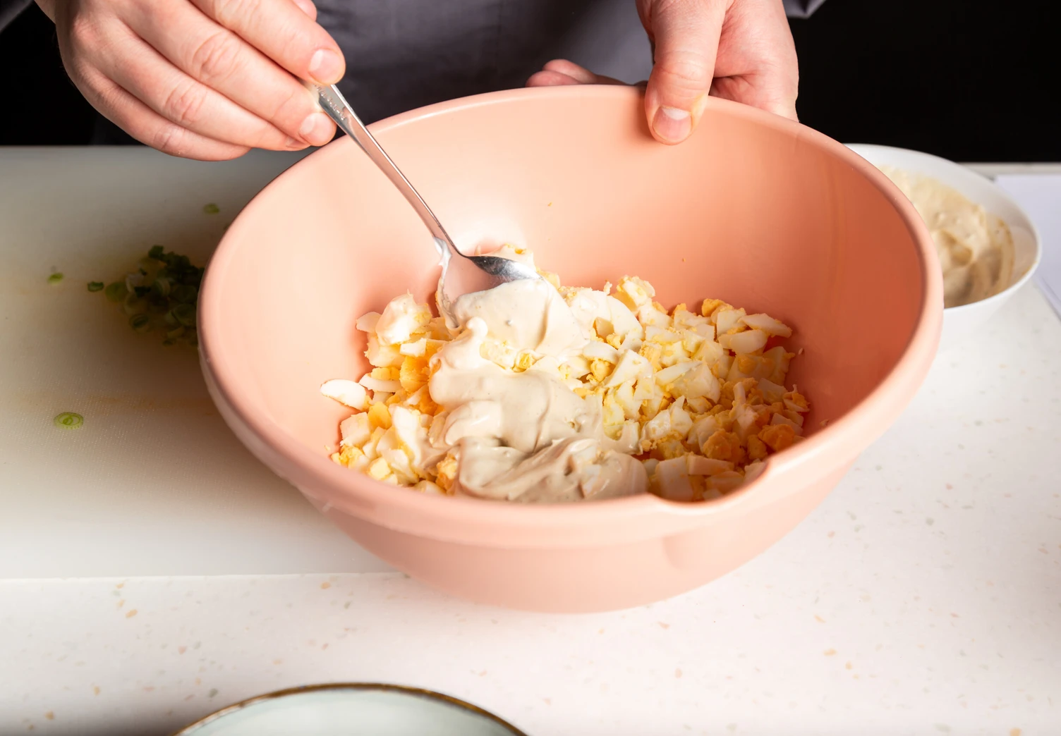 Смешайте заправку с нарезанными яйцами и украсьте салат рубленым зелёным луком.