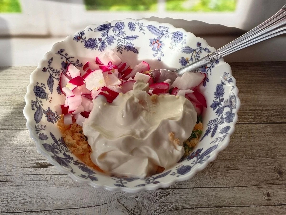 Смешайте редис, зелёный лук, желтки от яиц, чёрный перец и майонез до однородной массы.