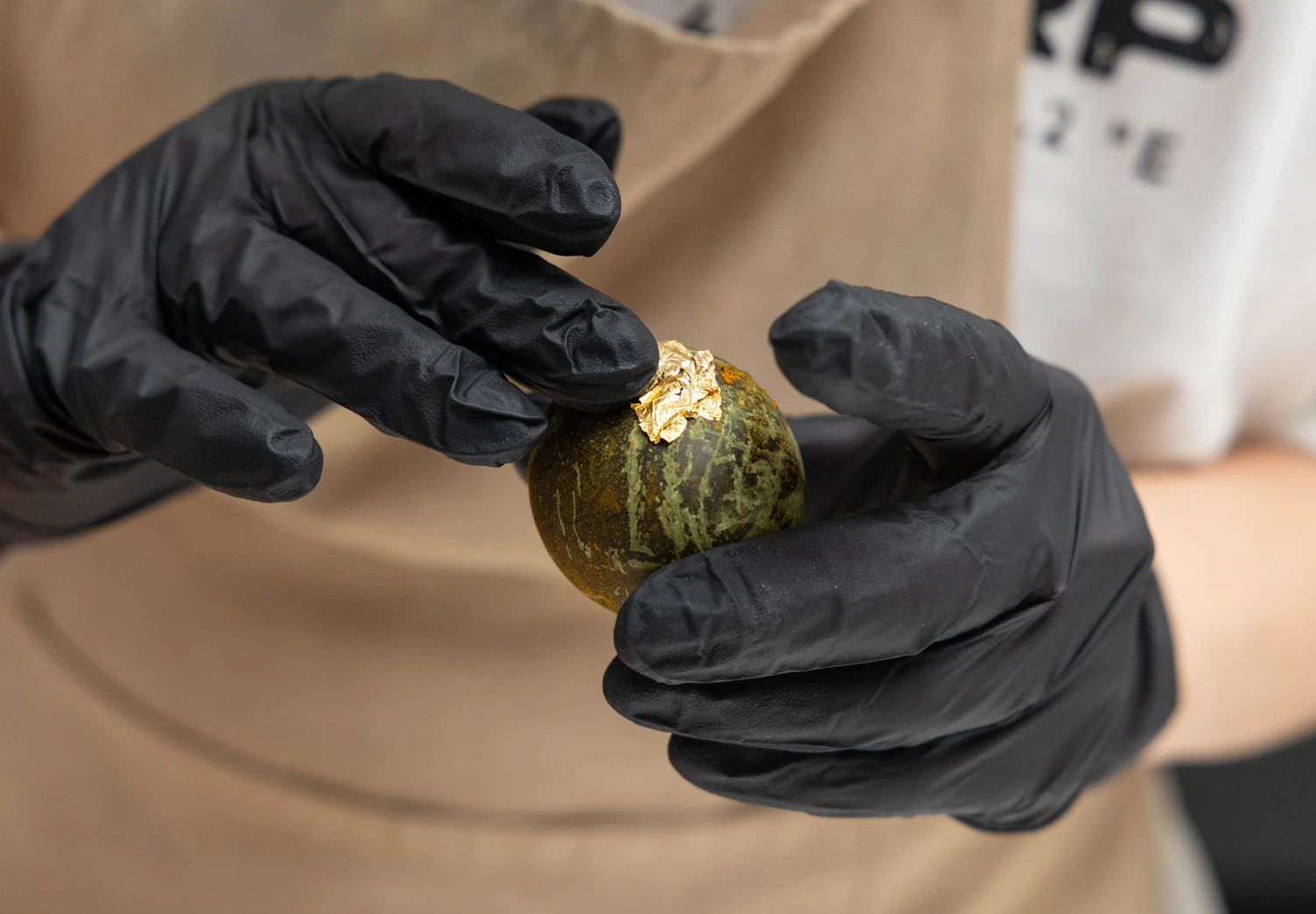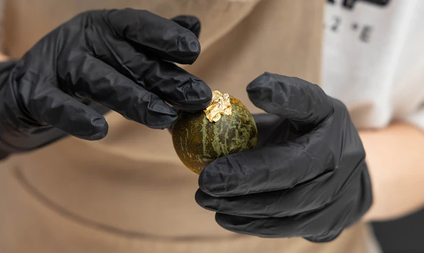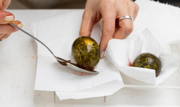 Наденьте перчатки, смажьте их яичным белком. Нанесите на каждое яйцо поталь и осторожно потрите руками скорлупу, чтобы золото перешло на её поверхность.