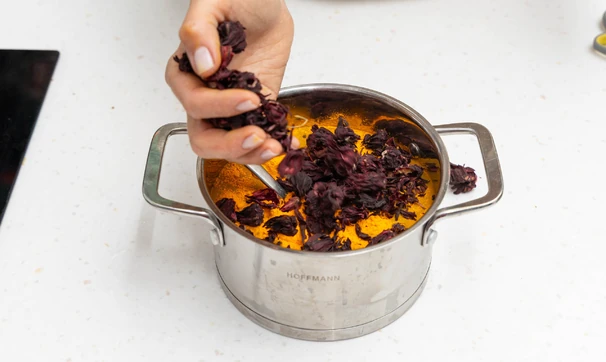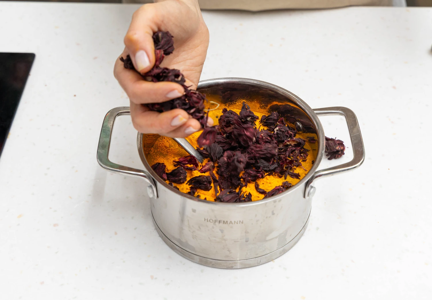 Выложите сырые яйца в кастрюлю. Влейте столько холодной воды, чтобы они были полностью покрыты. Всыпьте куркуму, соль и каркаде, доведите смесь до кипения и варите 10 минут.