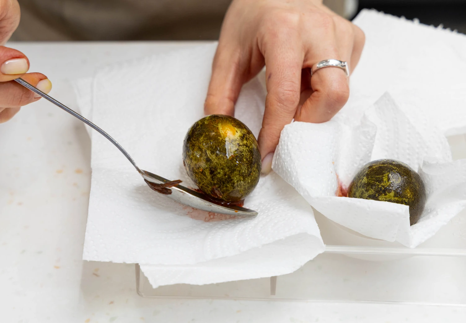 Сочетание каркаде и куркумы даёт удивительный эффект — яйца покрываются затейливым зелёным узором, будто малахит. Неслучайно в соцсетях за этим способом закрепилось название «Малахитовая шкатулка». А главное, такая красота создана только натуральными красителями.