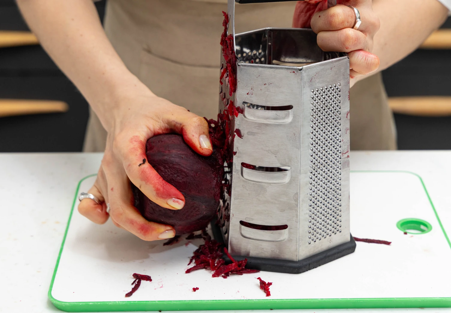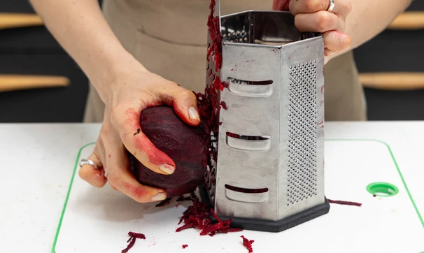 Свёклу натрите на крупной тёрке и смешайте с 2 ст. л. уксуса.