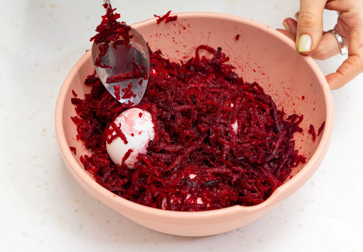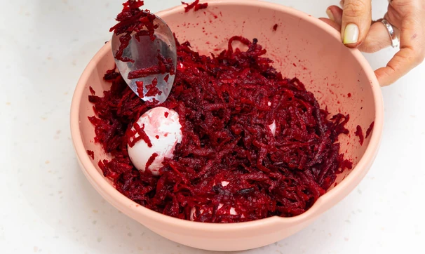 Заранее сваренные вкрутую яйца полностью покройте свекольной массой и оставьте на 15–20 минут.
