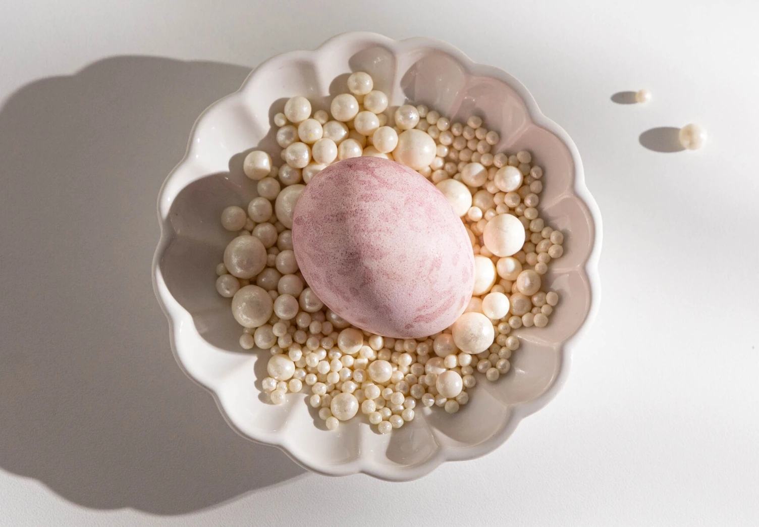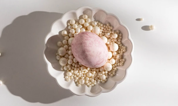 Свёкла дарит яйцам удивительно мягкий розовый оттенок — спокойный, благородный, без лишней яркости. В таком виде они уже украшают стол, но если хочется добавить торжественности, можно дополнить декор жемчужинками или пищевым золотом.