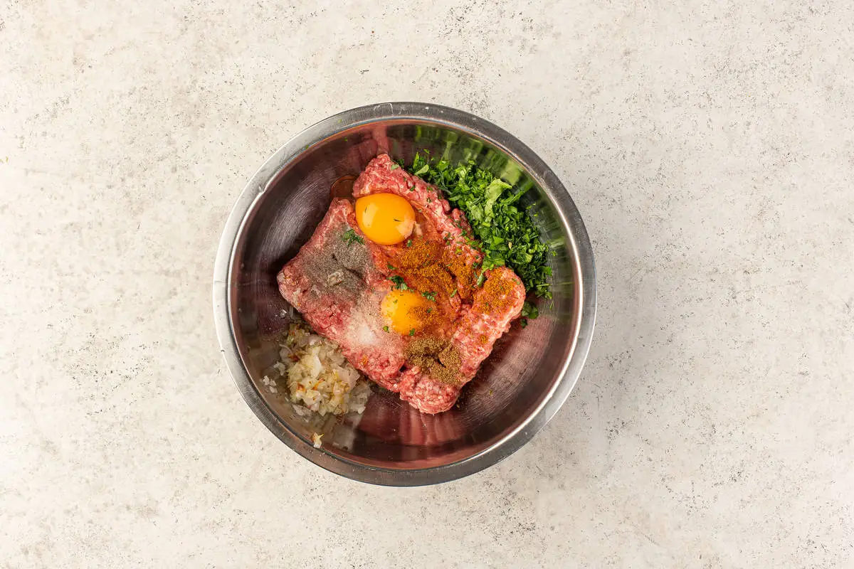Добавьте к фаршу лук, зелень, специи, муку, соль и перец, разбейте два сырых яйца. Перемешайте до однородности.