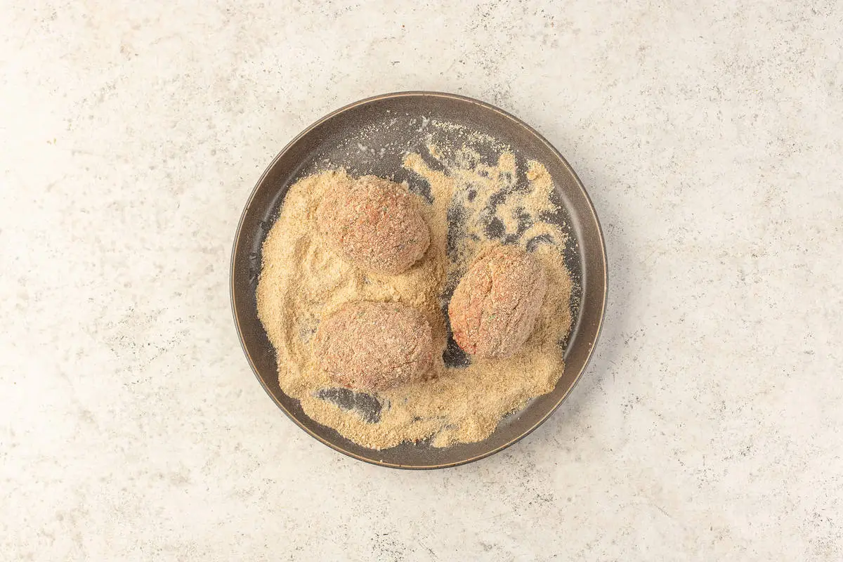 Отваренные яйца аккуратно очистите от скорлупы. Фарш разделите на 5 одинаковых шариков, каждый сплющите в небольшую лепешку. В центр каждой положите целое яйцо, аккуратно заверните в фарш так, чтобы получилась круглые котлетки. Обваляйте в сухарях.