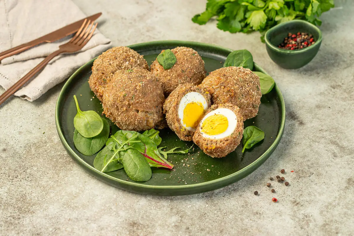Яйца по-шотландски можно подавать как сытное горячее блюдо или взять с собой на пикник в холодном виде, как это часто делают англичане. Чаще всего их готовят во фритюре, но мы предлагаем запечь в духовке, так точно получится полезнее.