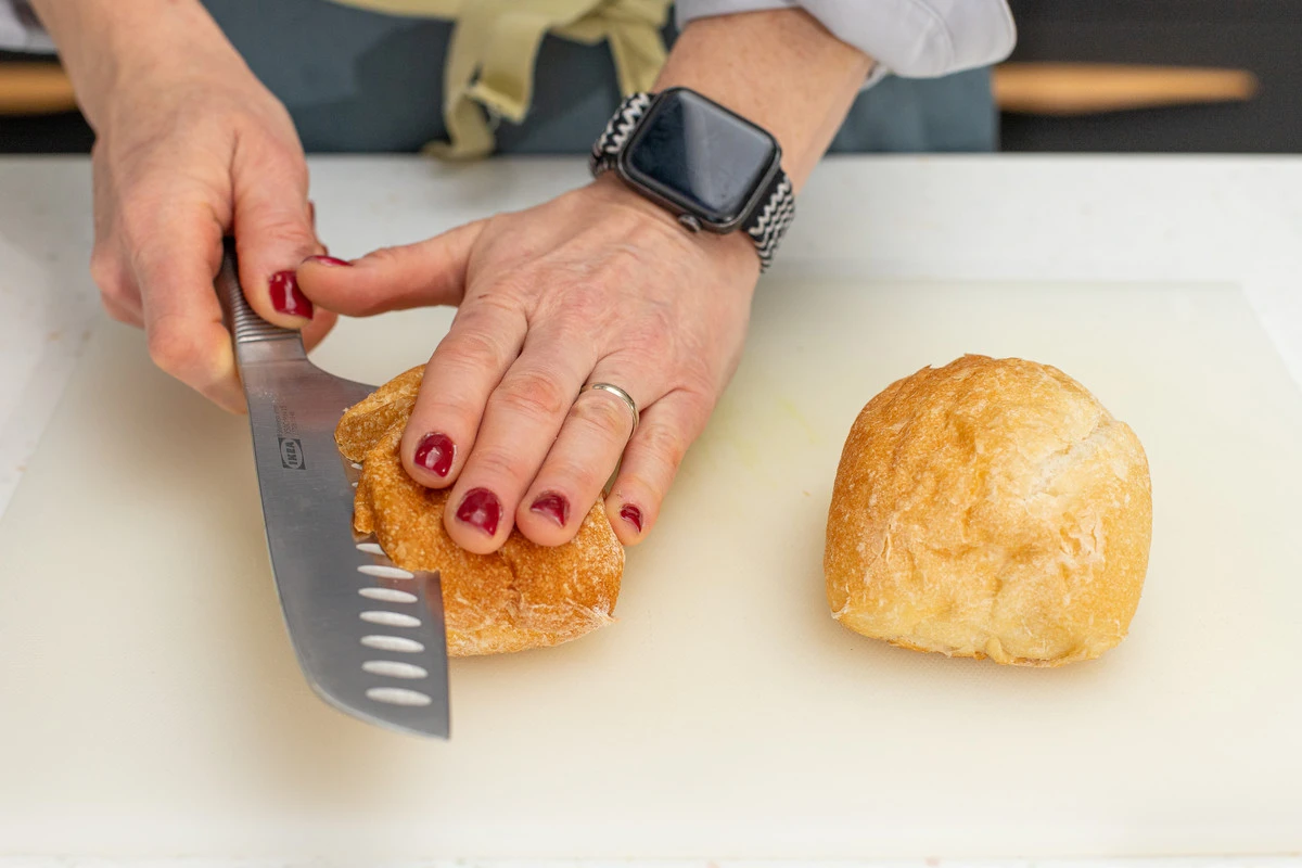 Мини-чиабатты разрежьте вдоль, чтобы получилась глубокая нижняя часть и небольшая крышечка.