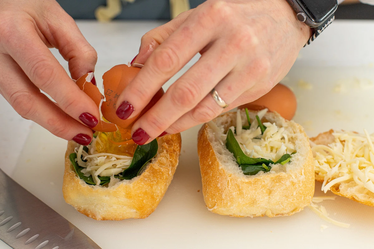 Положите в чиабатту листья шпината и сыр. Аккуратно разбейте по яйцу в каждую булочку.