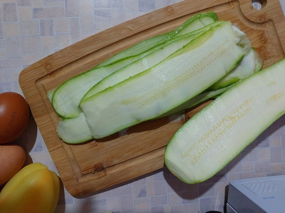 Промойте и просушите кабачок. Нарежьте кабачок тонкими слайсами.