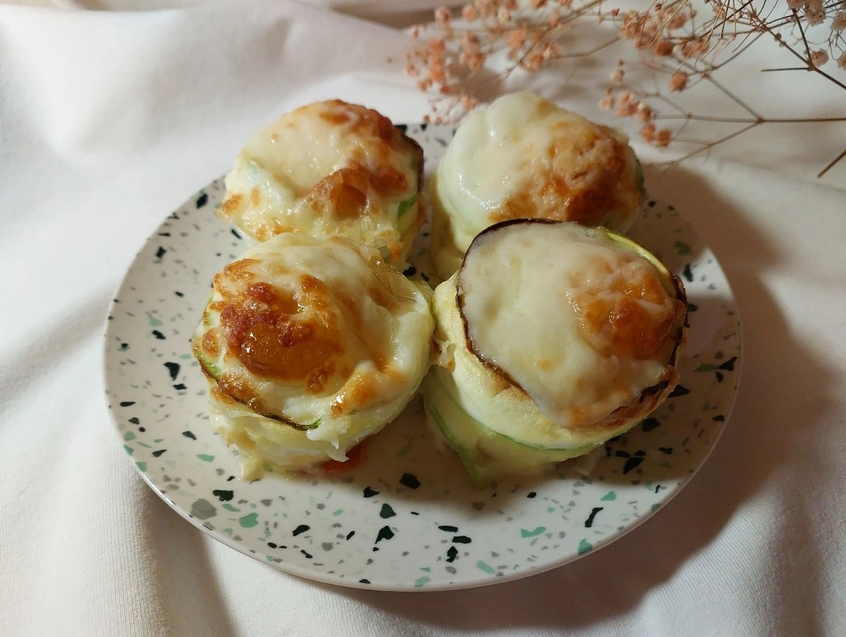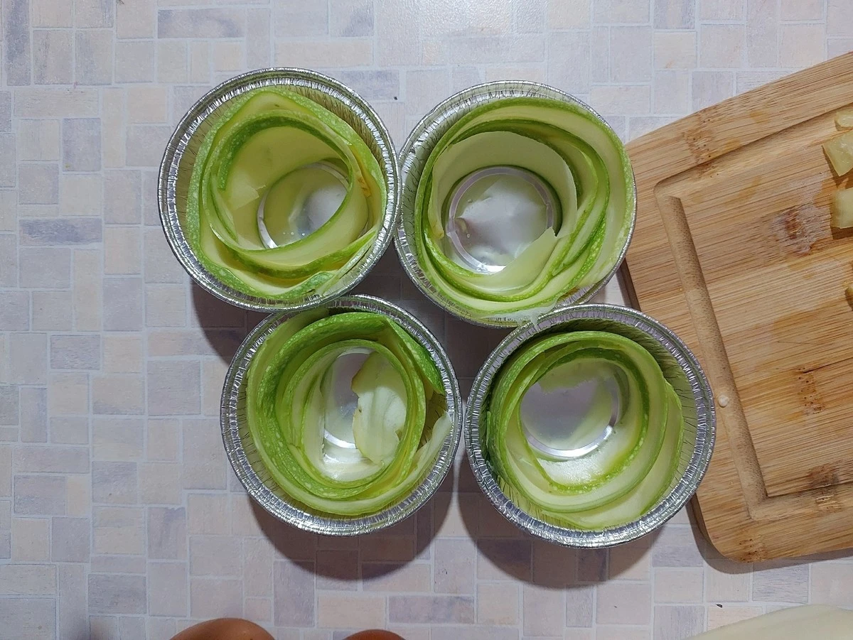 Смажьте формочки растительным маслом и выложите в каждую форму спиралью 2–3 слайса нарезанного кабачка.
