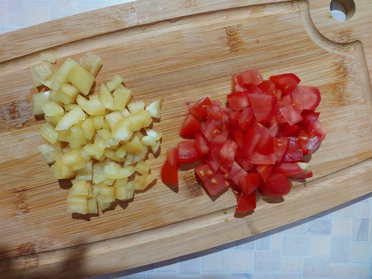 Промойте и просушите болгарский перец и помидор. Нарежьте небольшим кубиком.