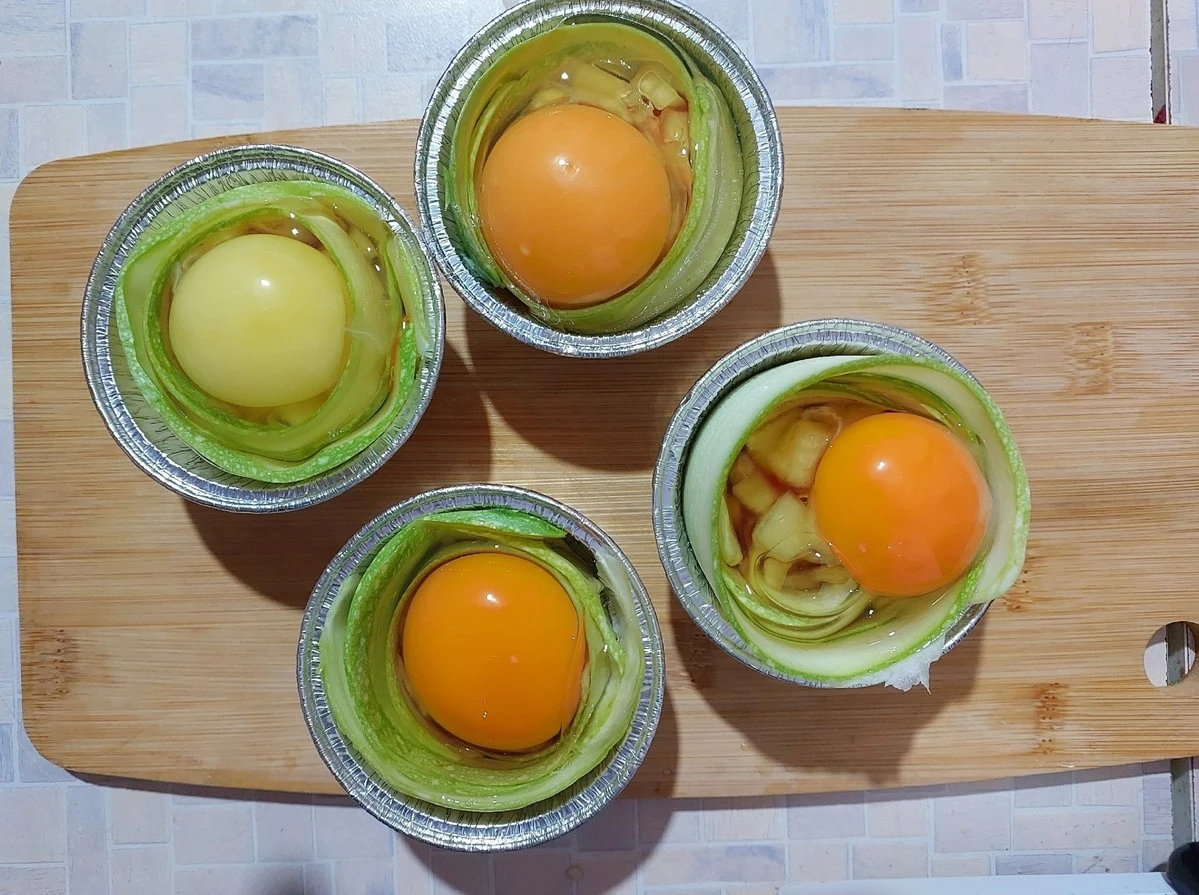 В каждую формочку с кабачком выложите нарезанный перец, помидор. Сверху влейте по одному яйцу. Посолите и поперчите по вкусу.