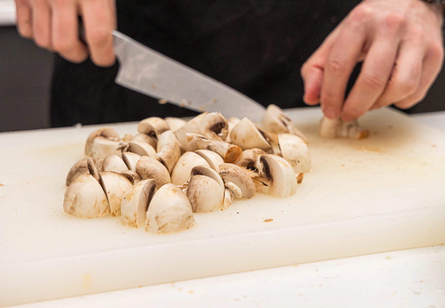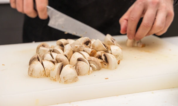 А вот в языке, наоборот, соединительной ткани очень мало, поэтому он такой мягкий и просто тает во рту. Подчеркнули его нежную текстуру и деликатный вкус соусом бешамель с грибами — получилось бесподобно!