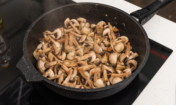 Разогрейте в сковороде растительное масло и выложите в сковороду нарезанные шампиньоны. Обжаривайте до золотистого цвета, периодически помешивая. Готовые грибы отложите в сторону.