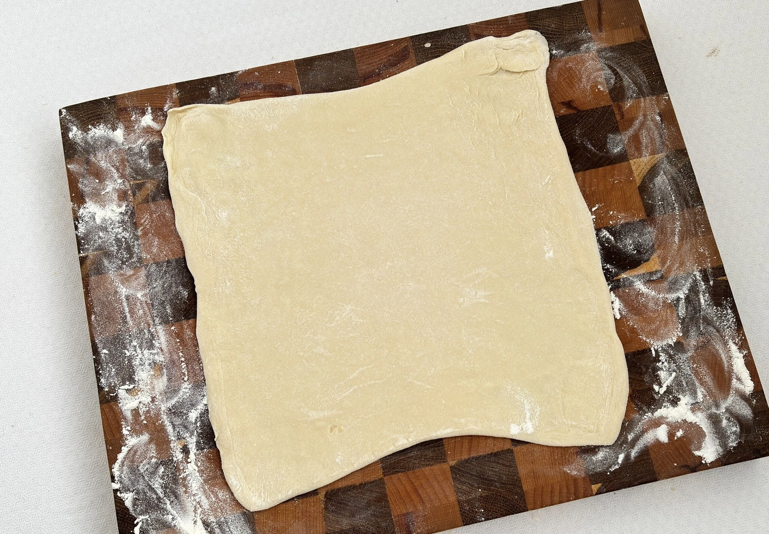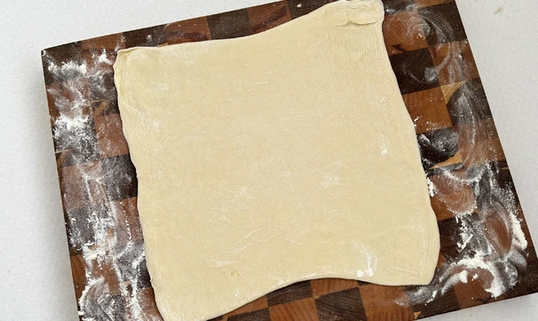 Перед приготовлением разморозьте тесто по инструкции на упаковке. Возьмите один размороженный прямоугольник теста, слегка присыпьте с двух сторон мукой и раскатайте в пласт. Важно раскатывать тесто только в одном направлении, чтобы не повредить слои.