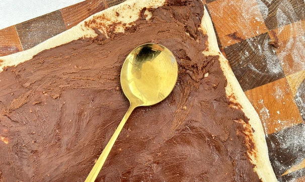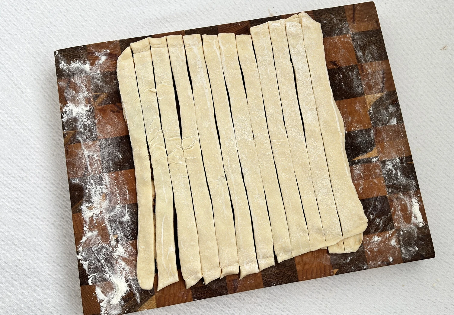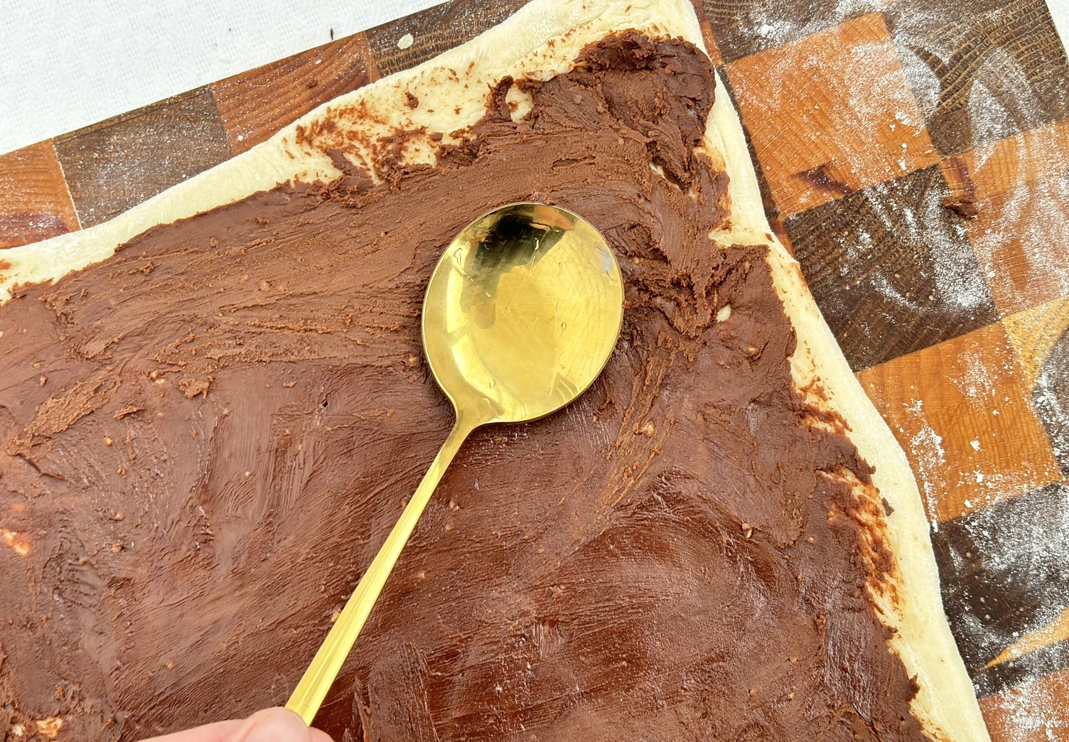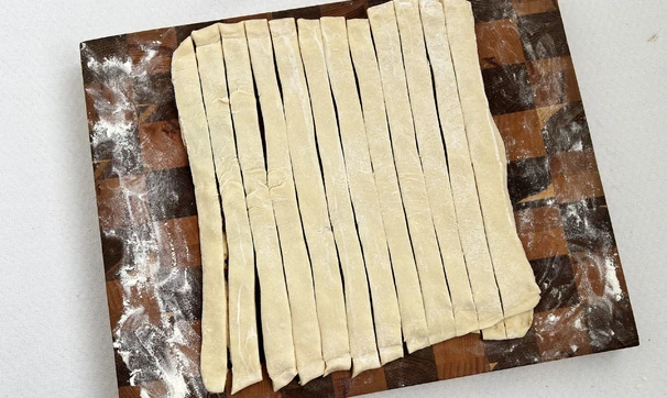 Раскатайте второй прямоугольник теста. На шоколадную пасту выложите второй пласт теста и нарежьте его на полоски шириной по 1,5-2 см.