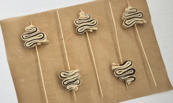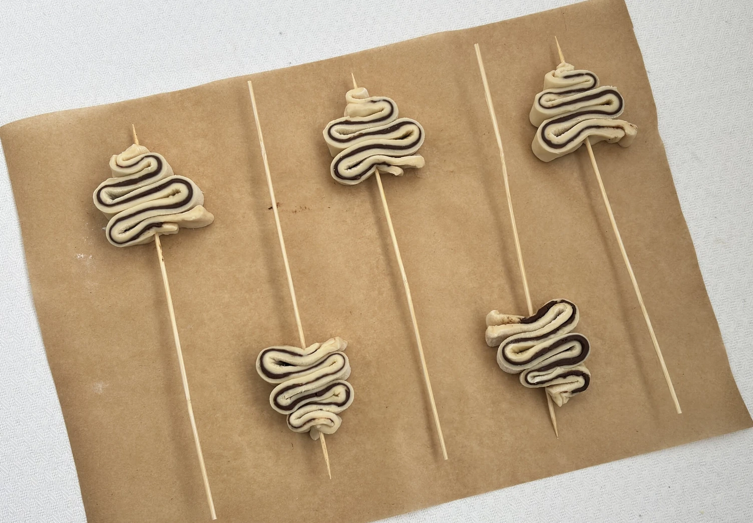 Возьмите одну полоску теста и начните складывать её, формируя ёлочку. В сложенные ёлочки воткните шпажки, оставляя сверху 3–4 см свободными, выложите на пергамент и отправьте в духовку, разогретую до 180°С, на 20–25 минут.