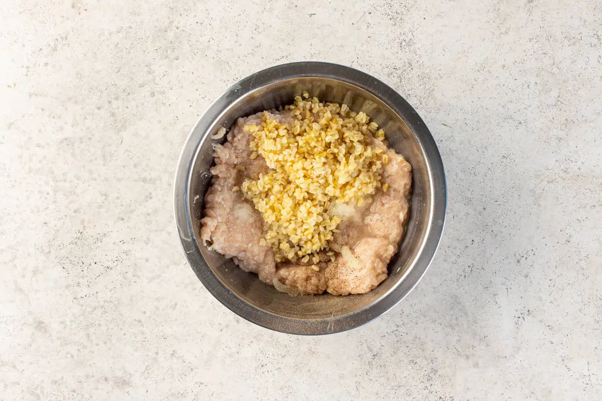 Смешайте фарш с булгуром, туда же натрите лук (используйте мелкую тёрку).