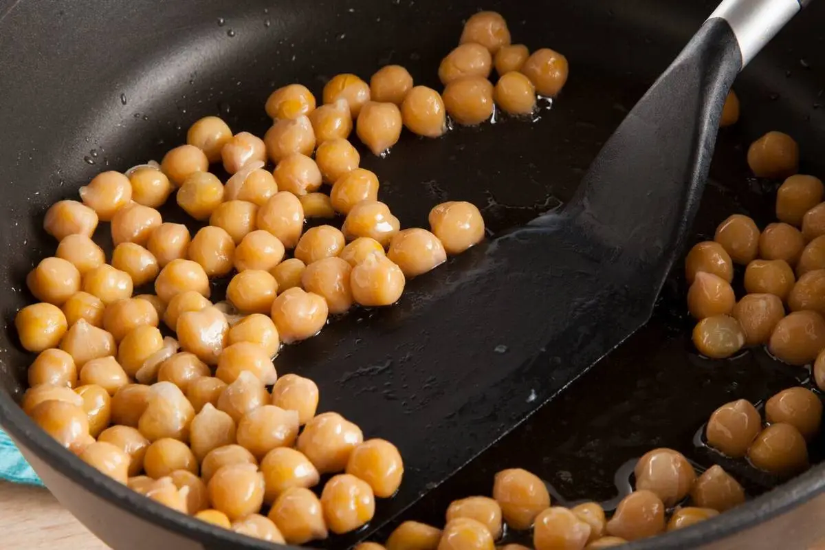 В сковороде разогрейте оливковое масло, выложите нут без жидкости, готовьте 5 минут на среднем огне.