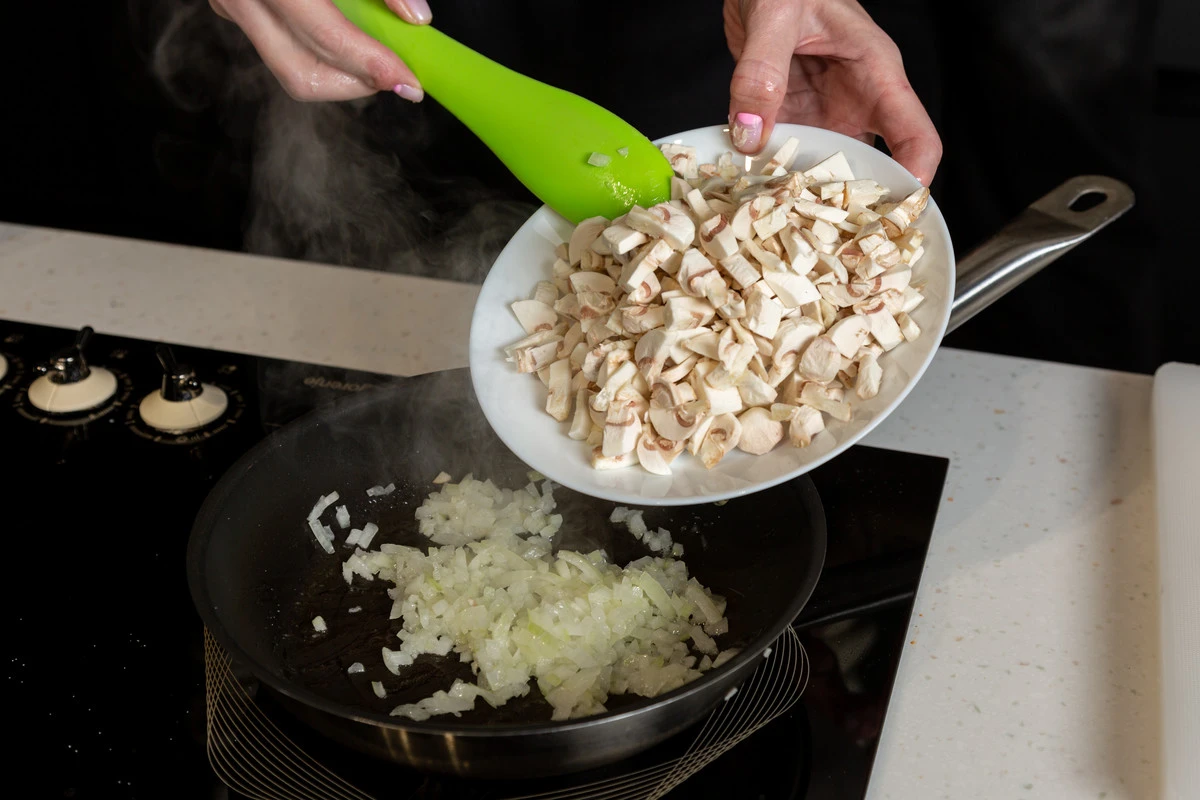 Нарежьте лук и грибы, обжарьте до готовности в смеси сливочного и растительного масел с добавлением соли, перца и сухого чеснока.