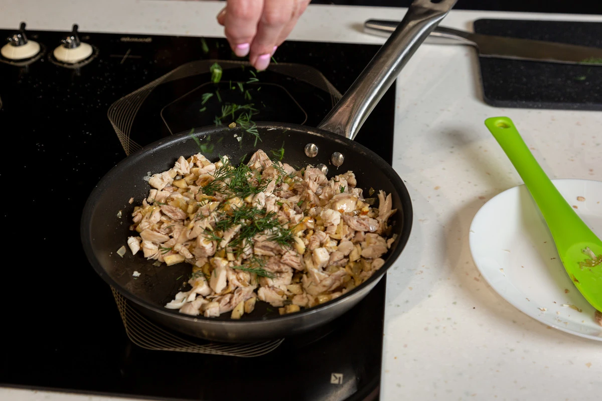 Соберите начинку: нарезанная курица, грибы с луком, затем укроп и тёртый сыр.