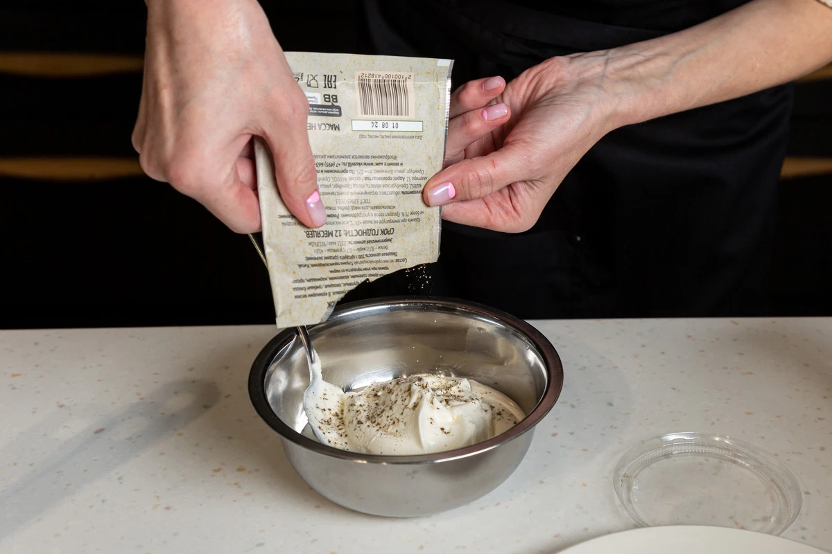 Для соуса смешайте майонез со сметаной и измельчённым чесноком, добавьте соль и перец по вкусу.