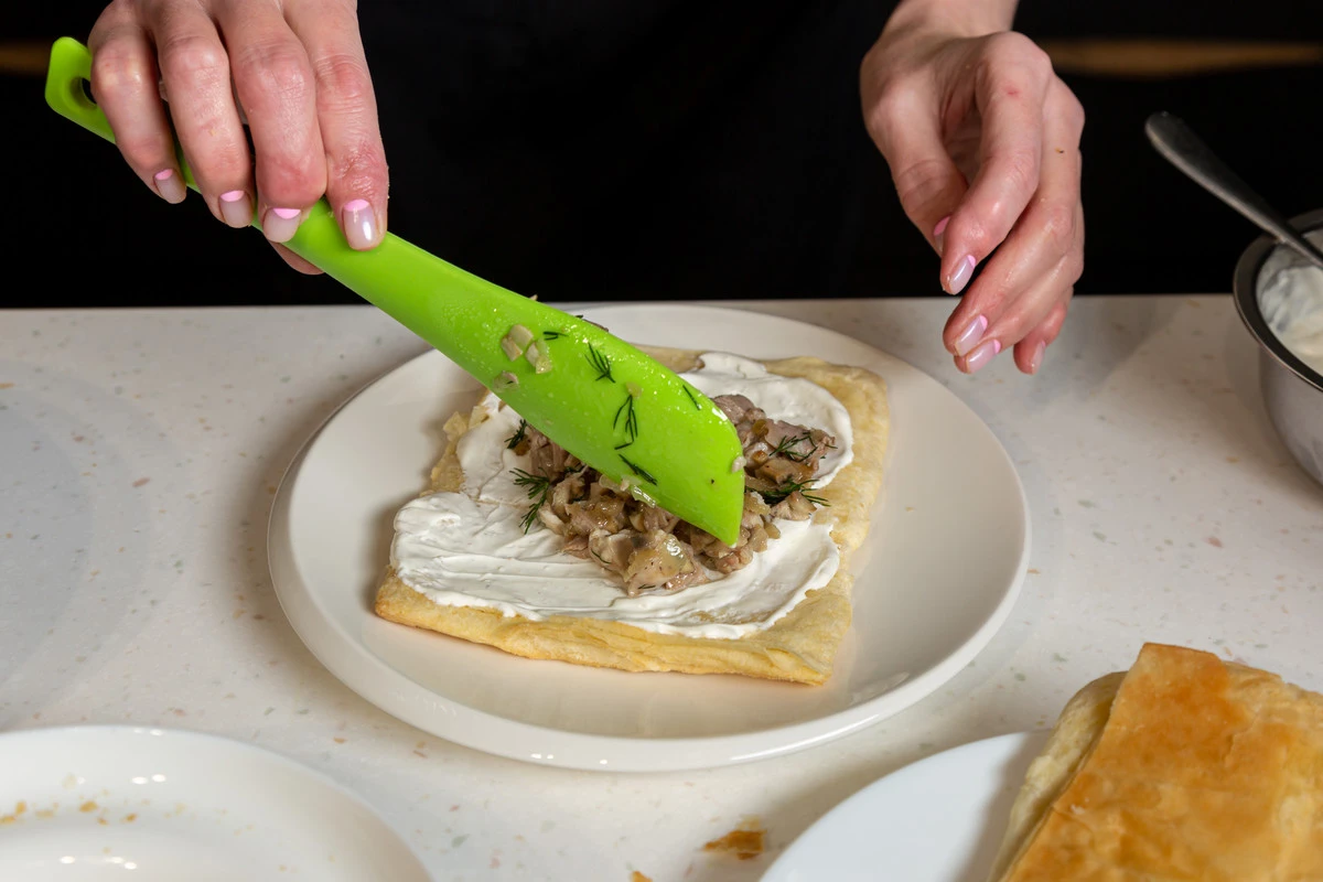 Праздничная закуска, которая выглядит, как торт «Наполеон». Можно приготовить за день до торжества — она станет только вкуснее. Начинку выбирайте любую: от простого, но беспроигрышного сочетания курицы и грибов до более изысканных версий вроде груши с голубым сыром.