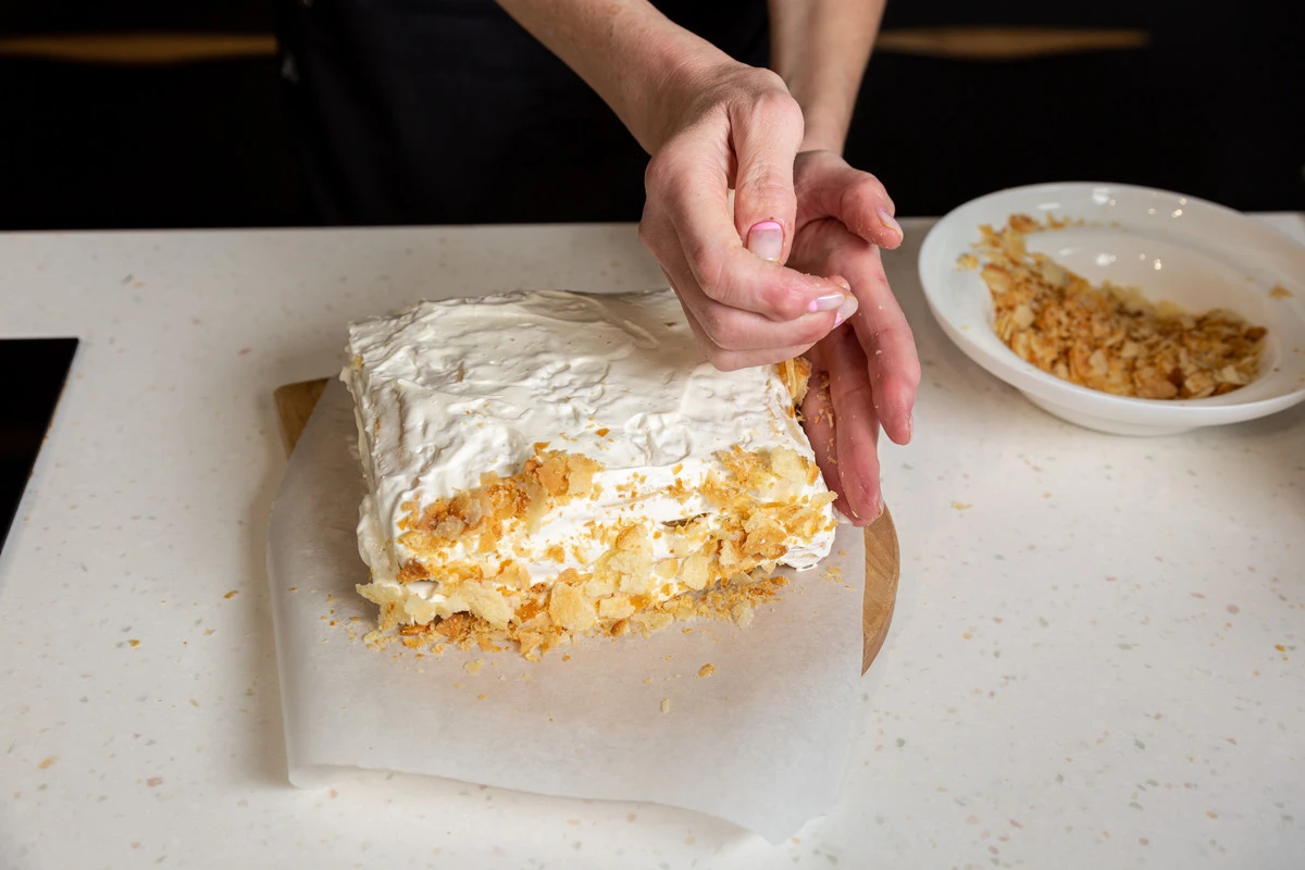 Соберите «торт»: корж, начинка, соус. Повторите три раза.
