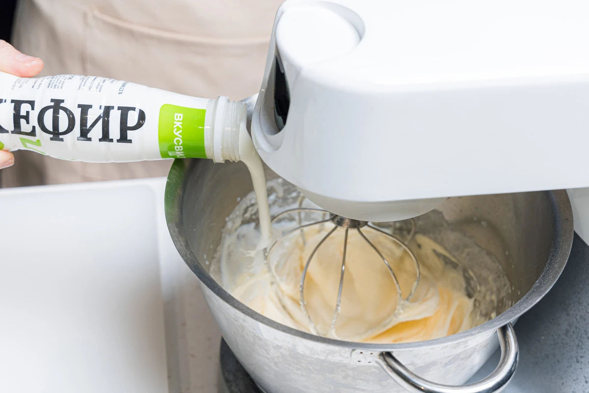 Продолжая взбивать, добавьте кефир, разрыхлитель (для этого рецепта его не обязательно предварительно перемешивать с мукой). Муку просейте, аккуратно добавьте в тесто и взбивайте всё вместе до консистенции очень густой сметаны (общее время взбивания — примерно 10-12 минут).