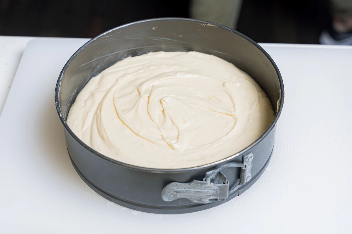 Смажьте разъёмную форму диаметром 22-24 см маслом. Вылейте тесто в форму, разровняйте поверхность.