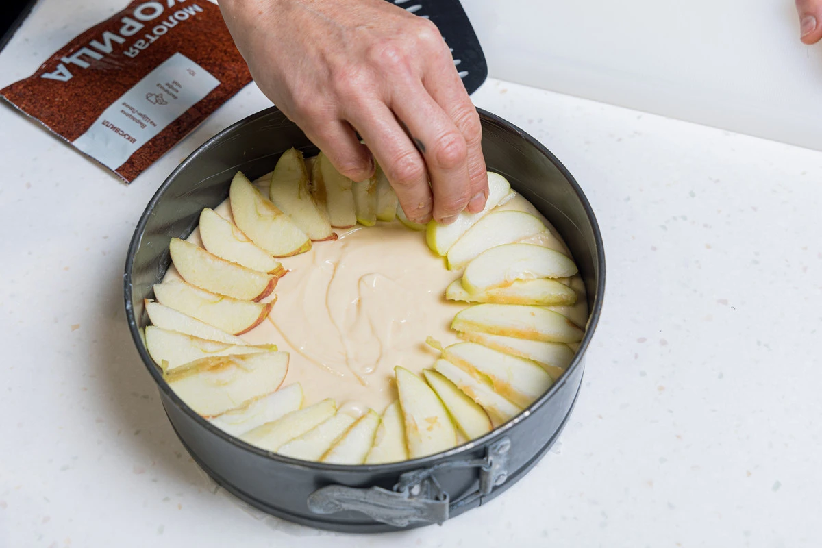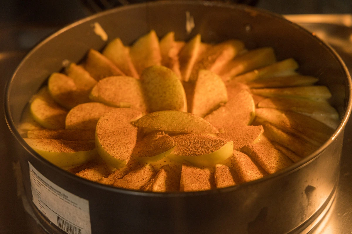 Выложите яблоки на тесто по кругу. Сверху присыпьте корицей.