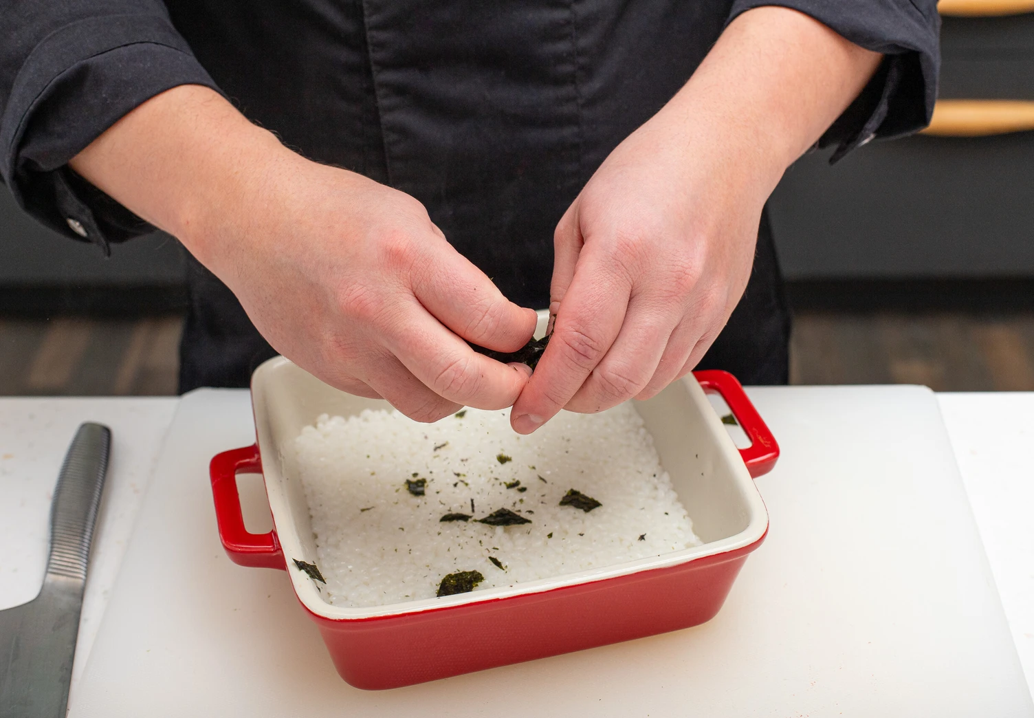Покрошите сверху произвольно нори так, чтобы полностью закрыть слой риса.