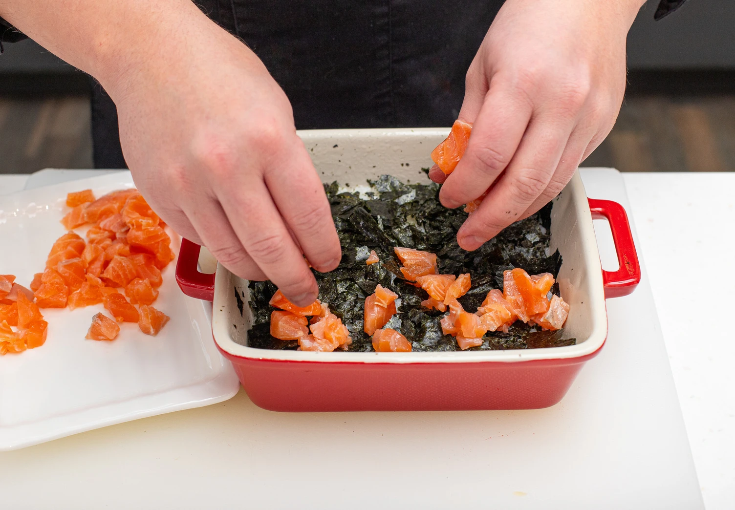 Рыбу порежьте мелким кубиком и выложите на водоросли.