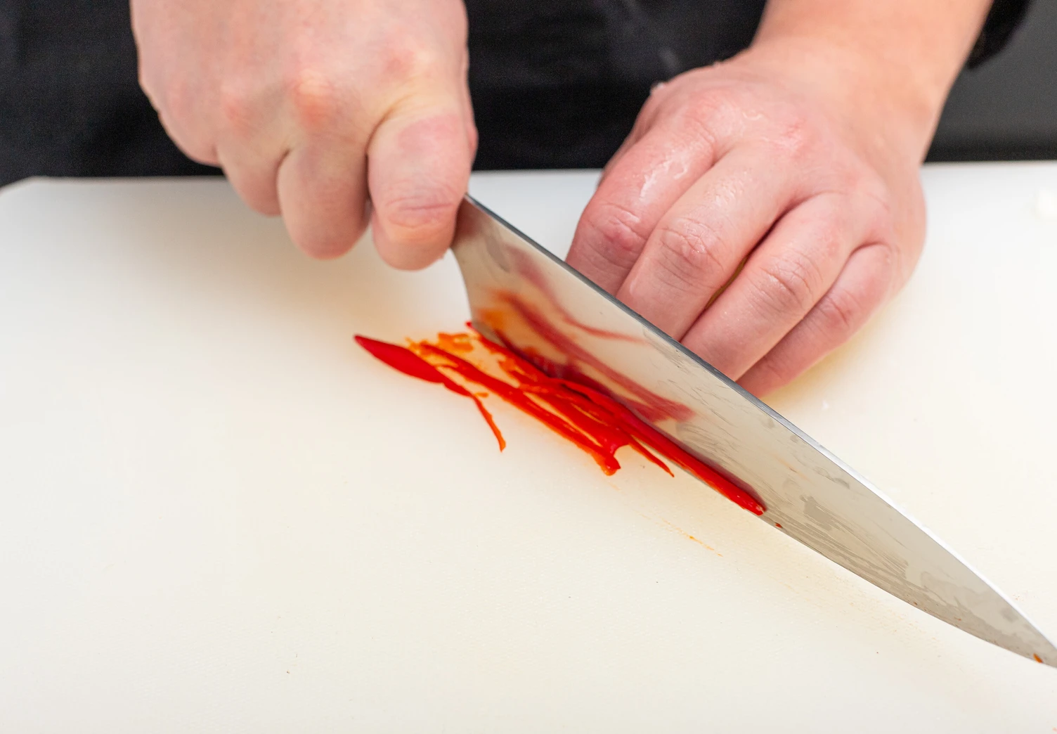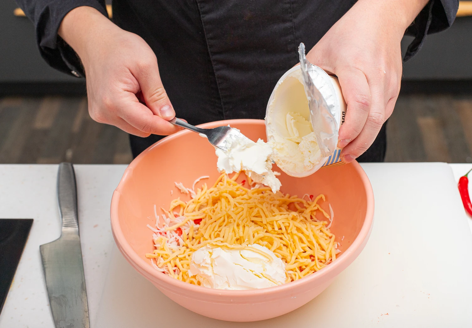 Для верхнего слоя смешайте в миске творожный и голландский сыр, чили и разобранные на волокна крабовые палочки. Перемешайте как следует.