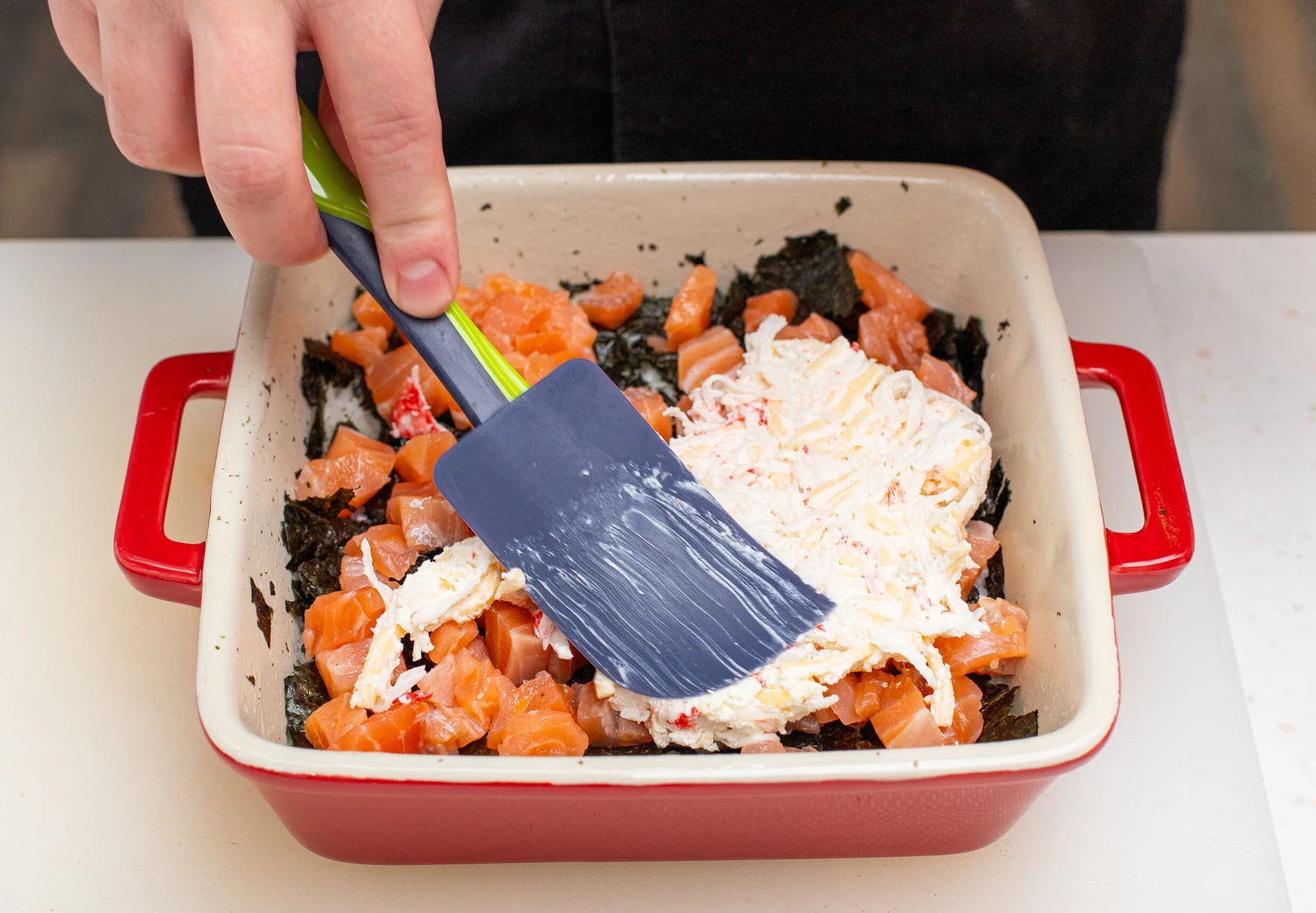 Запекайте суши-торт при 180 градусах 5–7 минут.
