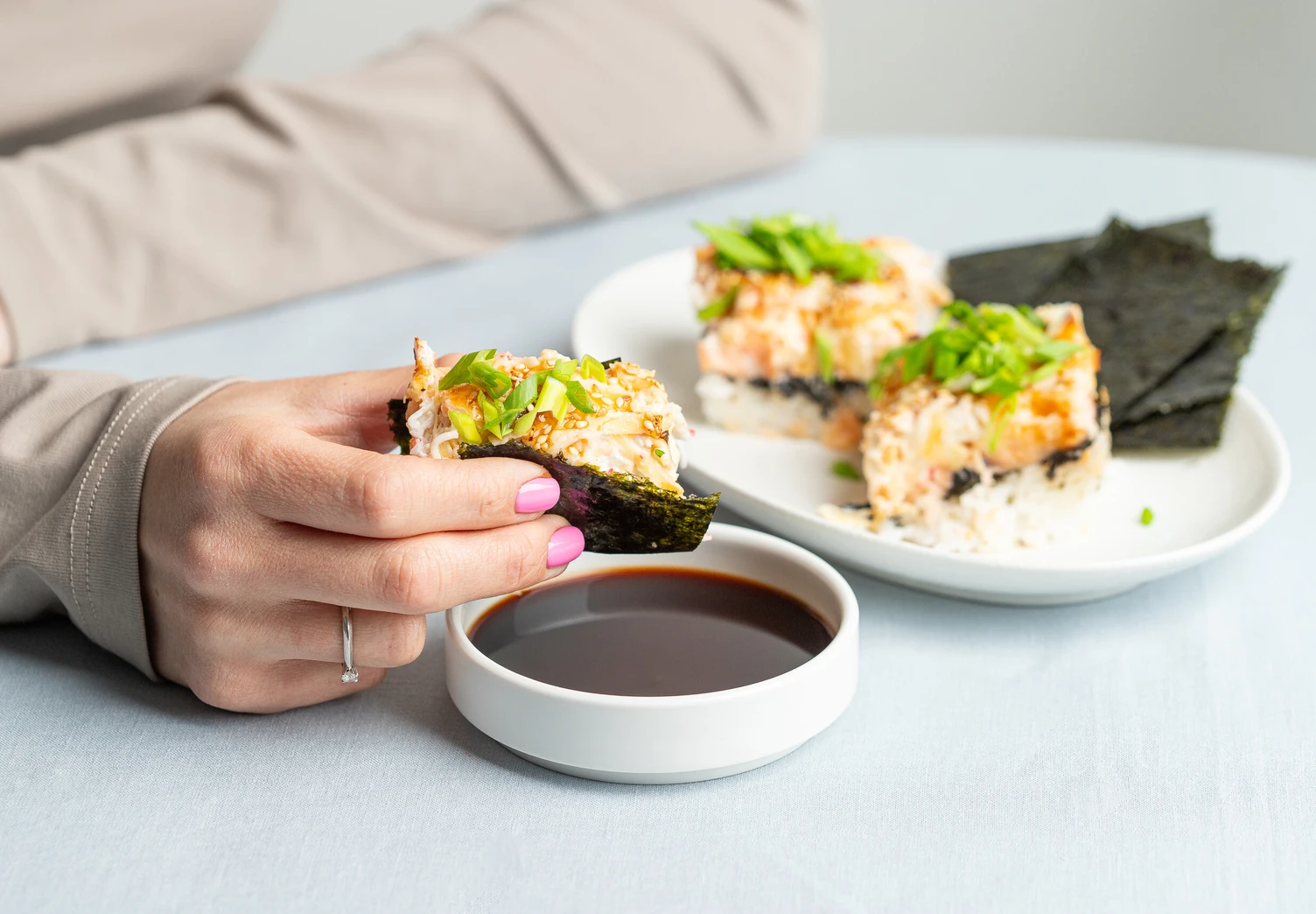 Подавайте порционно с нарезанными листами нори и соевым соусом.